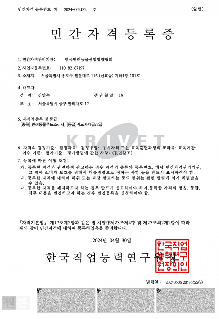 한국반려동물산업영양협회에서는 반려동물 관련하여 민간자격증 발급 등록이 완료하였음을 알려드립니다. 이와 관련하여 2024년부터 자격 시험을 실시할 예정입니다.