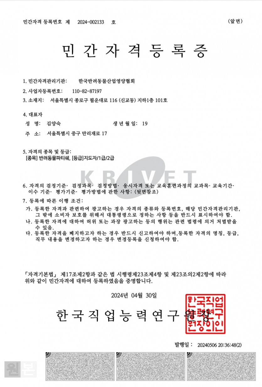 반려동물 파티쉐 지도자/1급/2급 자격증 취득 신청